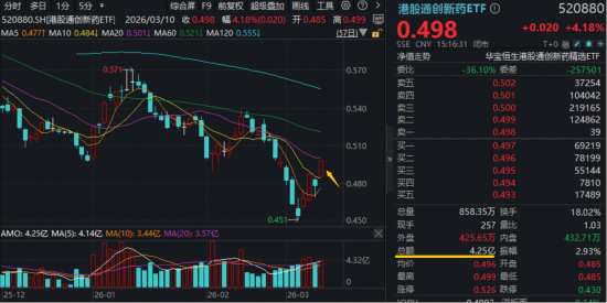 3月10日,创新药再度领跑,高弹性港股通创新药ETF(520880)盘中上攻5%,收涨4.18%站上10日线,放量成交4.25亿元。医疗股亦呈普涨态势,港股通医疗ETF华宝(159137)迅猛回血3.25%。